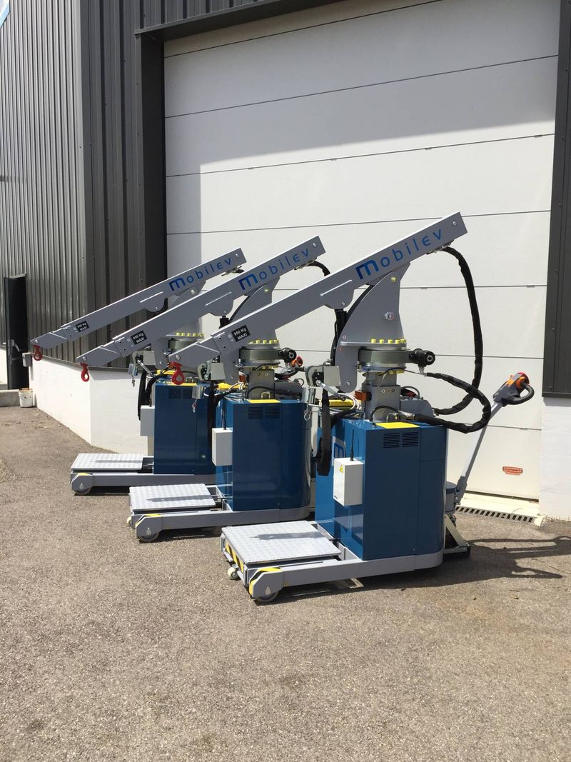 Cette mini-grue électrique à conducteur accompagnant intègre un plateau coulissant hydraulique pour poser la charge et assurer son transfert sans ballant.